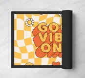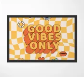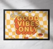 Füllen Sie Ihren Raum mit Positivität und Stil mit diesem Digitaldruck "Good Vibes Only". Dieses lebendige Grafikdesign zeigt die aufmunternde Botschaft in orangefarbenem Text vor einem dynamischen, verzogenen gelb-weiß karierten Hintergrund, umgeben von verspielten Illustrationen lächelnder Blumen, Herzen, Emojis und anderen coolen Symbolen. Es verkörpert eine retro-inspirierte Ästhetik, die Glück und gute Laune verbreiten soll. Diese hochwertige digitale Reproduktion hat eine Auflösung von 7000x5000 Pixeln bei 300 dpi, was eine hervorragende Klarheit, scharfe Linien und brillante Farben garantiert. Ein idealer Druck für