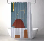 Geometrische Formen und Erdtöne schaffen ein modernes Design mit abstrakten Linien und Formen. Die Komposition umfasst sich überschneidende Rechtecke und einen Halbkreis, die durch goldene Akzente hervorgehoben werden.