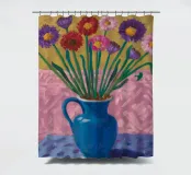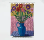 Ein lebhaftes Arrangement bunter Wildblumen in einer kräftigen blauen Vase. Der Hintergrund ist ein strukturiertes, gemustertes Rosa, das eine reiche und fröhliche Komposition voller Leben und Farbe schafft.