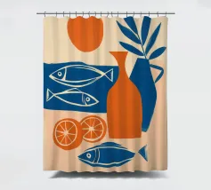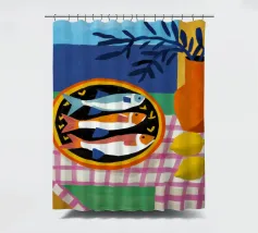 Ein modernes Stillleben mit gelben Zitronen, einem Krug und drei kleinen Fischen auf Tellern vor einem Hintergrund aus kräftigen roten, blauen und gitterartigen Mustern.