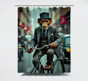 Affe auf Fahrrad mit Hochrad in viktorianischer Straße Ein charmanter Affe in einem dreiteiligen Anzug fährt auf einem alten Hochrad durch eine belebte viktorianische Straße. Die lebendigen Farben und scharfen Details erinnern an hyperrealistische Kunst.