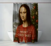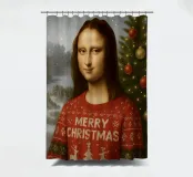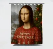 Mona Lisa trägt einen Weihnachtspulli am ersten Weihnachtstag. Mona Lisa trägt einen Weihnachtspulli mit der Aufschrift Frohe Weihnachten und einer Weihnachtsszene auf der Vorderseite. Hinter ihr steht ein Weihnachtsbaum mit Kugeln und Lichterketten. Im Hintergrund sind Schnee und eine Winterlandschaft zu sehen.