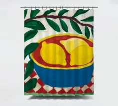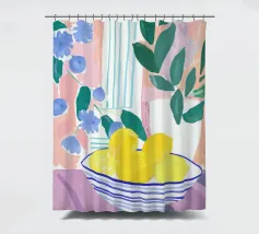 Ein sanftes und heiteres Stillleben einer Schale mit Zitronen auf einer gemusterten Oberfläche, mit fließenden grünen Blättern im Hintergrund, das in einer sanften, pastellartigen Palette wiedergegeben ist.