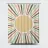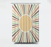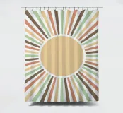 Strahlende Linien in erdigen Tönen wie Grün, Braun und Orange erstrecken sich von einem zentralen Kreis nach außen und erzeugen einen Sunburst-Effekt. Das Design weist eine Retro-Ästhetik mit symmetrischen Mustern und einer beruhigenden Farbpalette auf.