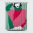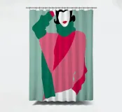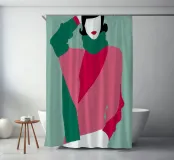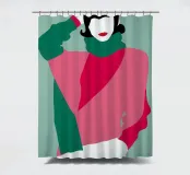 Ein Porträt einer Frau in einem stilvollen Retro-Outfit in Rosa und Rot mit einem grünen Kopftuch, die selbstbewusst posiert. Der grafische, farbige Blockstil ist sehr schick.