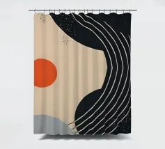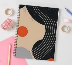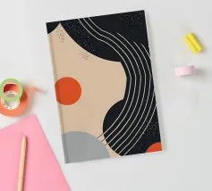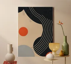 Abstrakte Formen und Linien bilden eine überzeugende Komposition mit kräftigen roten und grauen Kreisen, die sich von einem beigen und schwarzen Hintergrund abheben. Gebogene Linien sorgen für dynamische Bewegung, während gesprenkelte Texturen für Tiefe sorgen.