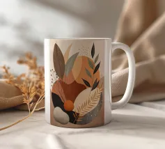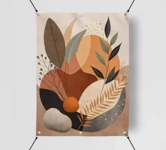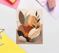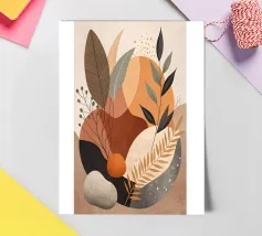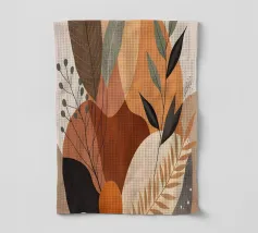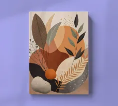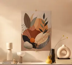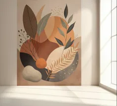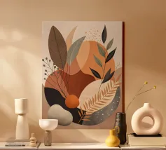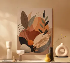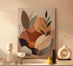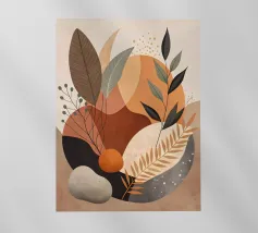 Ein fesselndes abstraktes Kunstwerk, inspiriert von den leuchtenden Farben und organischen Formen des Herbstes. Das Werk zeichnet sich durch eine harmonische Mischung aus Erdtönen, strukturierten Elementen und zarten botanischen Motiven aus und schafft eine ruhige und einladende Atmosphäre.