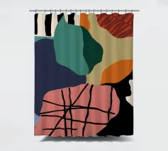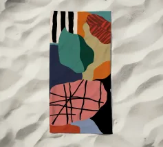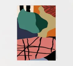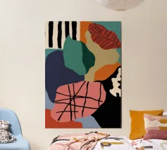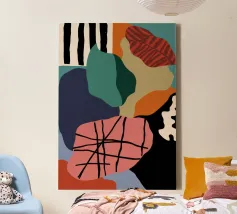Ein stimmungsvolles und anspruchsvolles abstraktes Werk, das organische Formen mit scharfen, grafischen Linien kombiniert. Die Farbpalette aus tiefem Marineblau, Rosarot und Schwarz schafft eine dramatische und moderne Ästhetik.