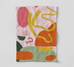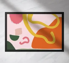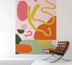 Eine energiegeladene und verspielte abstrakte Komposition aus verschnörkelten Linien und organischen Formen in einer leuchtenden, warmen Farbpalette. Das Kunstwerk ist voller Bewegung, Spontaneität und ungehemmtem kreativen Spaß.