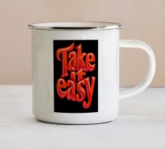 Ein lebhaftes typografisches Design im Retro-Stil mit dem Satz "Take It Easy" in fetten, von den 70er Jahren inspirierten Buchstaben. Die warme Mischung aus Rot, Blau und Mintgrün mit Sternenakzenten sorgt für ein verspieltes und nostalgisches Gefühl, perfekt für eine entspannte und stilvolle Ästhetik. Ein stilvolles, nostalgisches Stück, das Ruhe und Freude ausstrahlt. Entworfen von showmemars