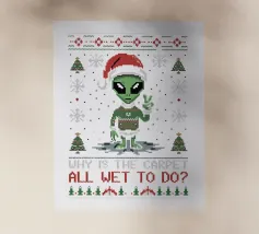 Ein Außerirdischer mit Weihnachtsmannmütze und Weihnachtspullover steht umgeben von Schneeflocken und Weihnachtsbäumen. Das Design fragt humorvoll "Warum ist der Teppich so nass?" in festlichen Farben.