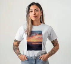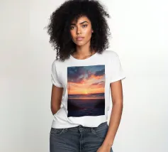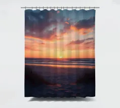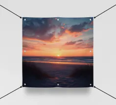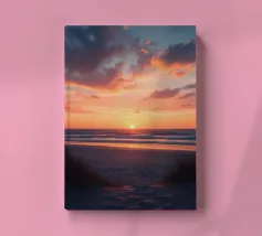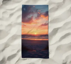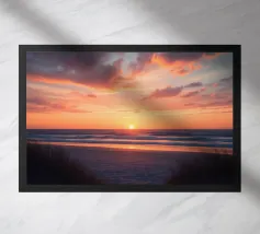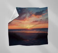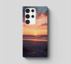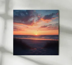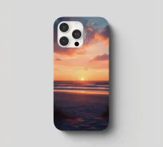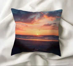 Ein atemberaubender Sonnenuntergang taucht den Himmel in warme Farben, während die Sonne unter den Horizont sinkt. Sanfte Wellen plätschern gegen das Ufer und schaffen eine heitere Abendstimmung.