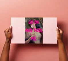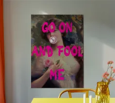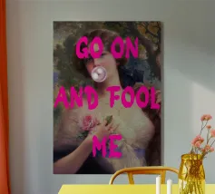 Lassen Sie sich von dem verschmitzten Charme von "Go On and Fool Me" verzaubern, einem fesselnden Pop-Art-Druck, der klassische Porträts mit einer spielerischen, zeitgenössischen Herausforderung verbindet. Dieses faszinierende Kunstwerk zeigt eine schöne historische Figur, die mit zarten Blumen und einer subtilen Bubblegum-Blase verziert ist. Der fettgedruckte, pinkfarbene Text "GO ON AND FOOL ME" überlagert das Bild und verleiht ihm eine witzige und etwas trotzige Aussage. Es ist eine perfekte Mischung aus zeitloser Eleganz und modernem Humor, ideal, um jedem modernen Interieur Persönlichkeit und einen Hauch von unbeschwerter Faszination zu verleihen. Mit einer außergewöhnlichen Auflösung von 7000x5000 Pixeln gefertigt