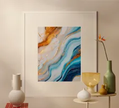 Eine moderne abstrakte Komposition mit sich überlappenden Kreisformen in sanften Beige-, Pfirsich- und Marinetönen. Zarte Linien und subtile Texturen schaffen Tiefe und Bewegung, während feine gepunktete Akzente einen verspielten und doch raffinierten Touch verleihen. Dieses minimalistische Design verbindet Eleganz mit zeitgenössischem Charme und ist damit ein vielseitiges Stück für moderne Innenräume.