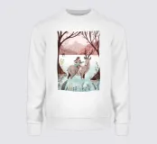 Ein Reiter begibt sich auf dem Rücken eines majestätischen Hirsches auf eine Reise durch eine verschneite Landschaft. Die fernen Berge schimmern unter einem kühlen Dämmerungshimmel, der von stillen Abenteuern und Ruhe zeugt.