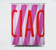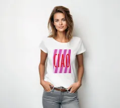 Das Textposter mit dem italienischen Wort "Ciao" in großen roten Druckbuchstaben strahlt Lebensfreude aus. Umgeben von pinken und weiß-rosa Querstreifen vermittelt es eine fröhliche Stimmung. Diese typografische Illustration ist der perfekte Sommer-Motiv für Begrüßungen und Abschiede.