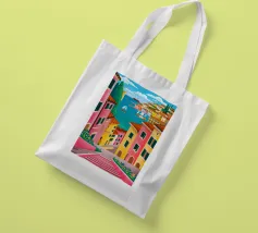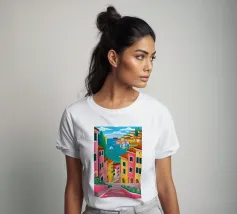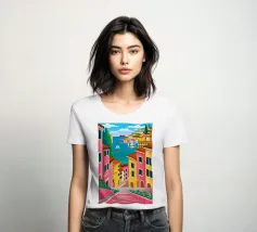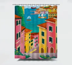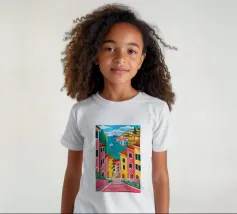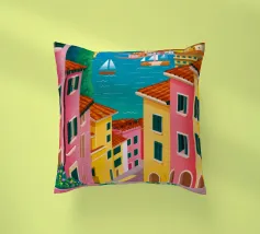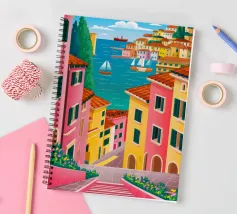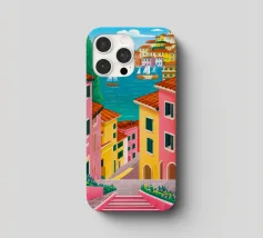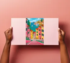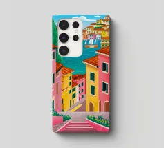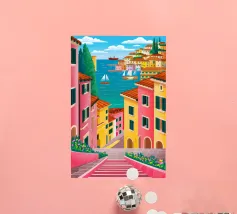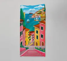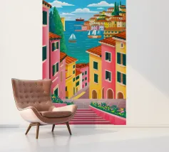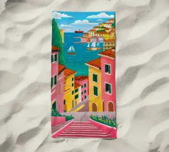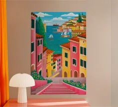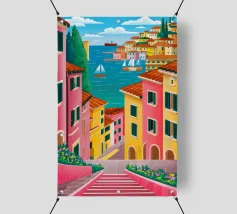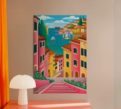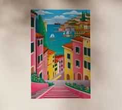 Eine schöne Illustration einer langen Treppe, die durch die bunten Häuser einer Küstenstadt wie Positano hinunter zum Meer mit Segelbooten führt. Die Szene ist eine malerische, ikonische und perfekte Darstellung eines italienischen Sommers.