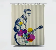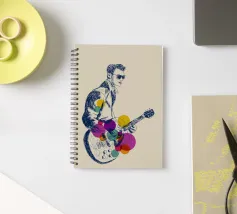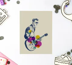 Eine dynamische Skizze eines Rockgitarristen inmitten seines Auftritts, dargestellt in ausdrucksstarken marineblauen Linien. Er trägt eine Sonnenbrille und einen selbstbewussten Gesichtsausdruck und hält seine E-Gitarre inmitten von leuchtenden, sich überlappenden Kreisen in Gelb, Grün, Rosa und Lila. Der Kontrast zwischen den groben Linien und den klaren, kräftigen Farben vermittelt ein Gefühl von Bewegung und Klang - fast so, als würde die Musik visuell Gestalt annehmen. Vorschläge für den Titel: