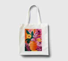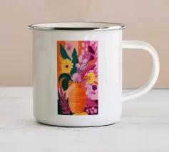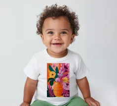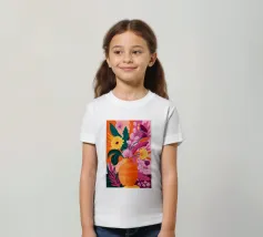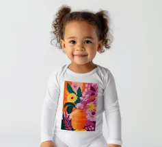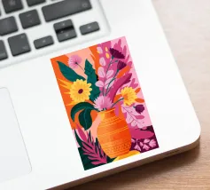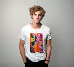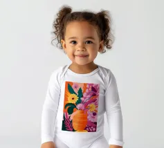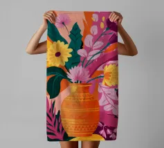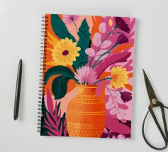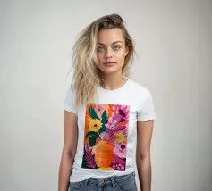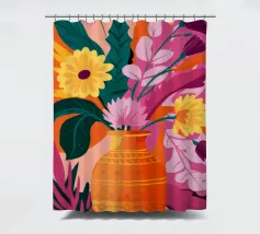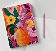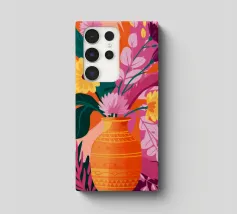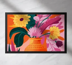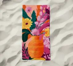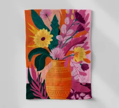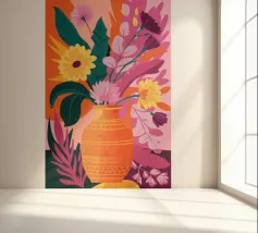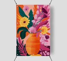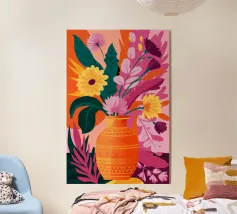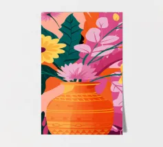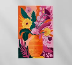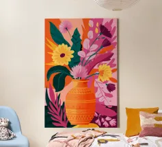Ein lebhafter Strauß abstrakter Blumen in satten Orange-, Violett- und Gelbtönen bricht aus einer orangefarbenen Vase vor einem dunklen Hintergrund hervor und vermittelt intensive Energie und eine dramatische Blumendarstellung.