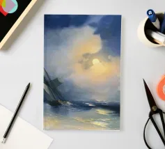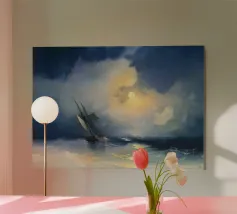 Ivan Aivazovskys Sturm auf dem Meer in einer mondhellen Nacht zeigt die ehrfurchtgebietende Kraft der Natur. Dunkle Gewitterwolken ziehen über den Himmel, während die Wellen unter dem flüchtigen Schein des Mondes heftig schlagen. Die Spannung zwischen Aufruhr und Licht fängt sowohl die Gefahr als auch die Schönheit ein und macht dieses Gemälde zu einem dramatischen Mittelpunkt für alle Liebhaber von maritimer Kunst und nautisch inspirierter Kunst, romantische Seelandschaft, Sturm auf dem Meer, nautische Wanddekoration, Sturm auf dem Meer, maritimes Drama, russischer Marinekünstler, Marineschiff im Sturm, atmosphärische Seelandschaft, nächtliche Seekunst, Wanddekoration an der Küste, nautisches Geschenk, Seekraft-Gemälde