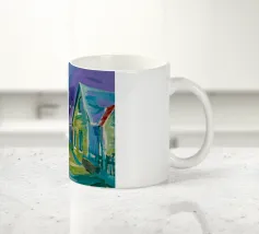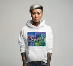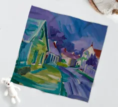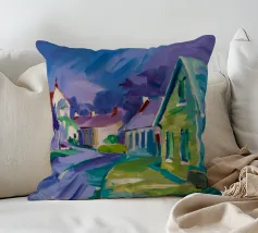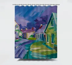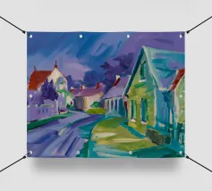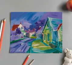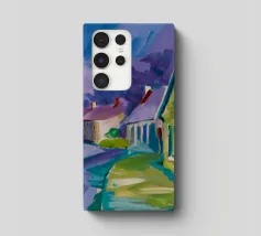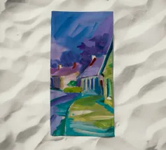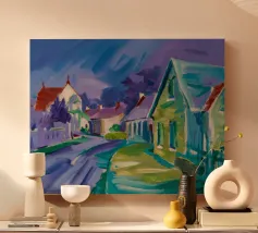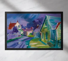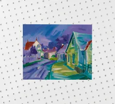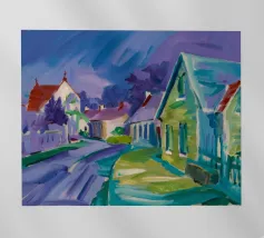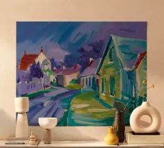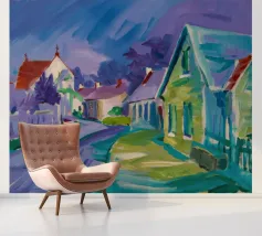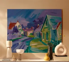Ein expressionistisches Gemälde einer Dorfstraße mit kühn gefärbten Häusern in Grün-, Blau- und Weißtönen und einer auffälligen violetten Straße, die das Auge führt, alles unter einem hellen, energiegeladenen Himmel.
