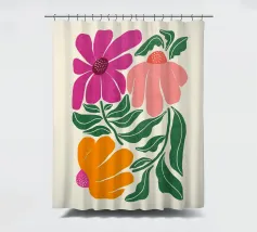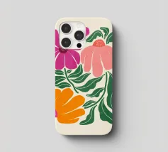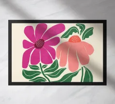 Skurrile abstrakte Gänseblümchenblüten in leuchtenden Rosa- und Orangetönen mit üppigem grünen Laub.