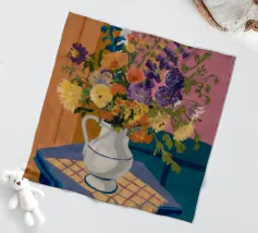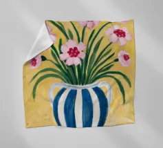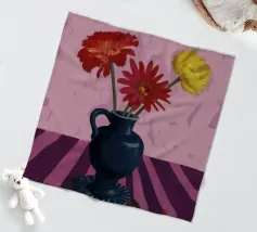 Ein lebhaftes Arrangement bunter Wildblumen in einer kräftigen blauen Vase. Der Hintergrund ist ein strukturiertes, gemustertes Rosa, das eine reiche und fröhliche Komposition voller Leben und Farbe schafft.