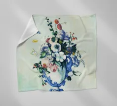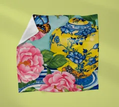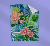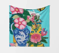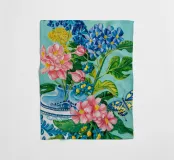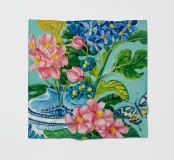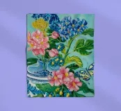 Ein lebhaftes Stillleben mit einer blau-weiß gemusterten Vase, die mit blauen Hortensien und anderen Blumen überquillt, mit Schmetterlingen vor einem hellen türkisfarbenen Hintergrund.