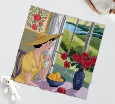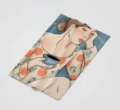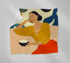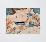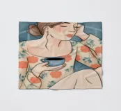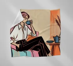 Das Gemälde zeigt eine Person, die bequem mit einer Tasse Tee in der Hand sitzt. Die blumengemusterte Kleidung und der ruhige Ausdruck vermitteln ein Gefühl von Ruhe und Entspannung.