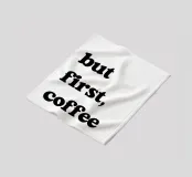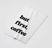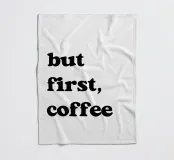 Der Satz "but first, coffee" steht in fetten, schwarzen Lettern auf einem schlichten weißen Hintergrund. Er unterstreicht die Vorliebe für Kaffee als Priorität.