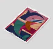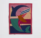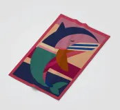 Geometrische Delphin-Illustration im farbenfrohen, modernen Stil der Jahrhundertmitte mit abstrakten Formen und leuchtenden Farben.