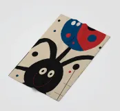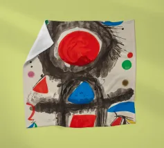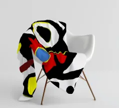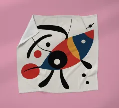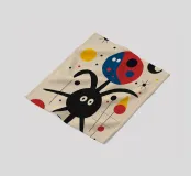 A whimsical and abstract depiction features a cheerful creature with a round body and multiple limbs, surrounded by colorful geometric shapes and playful lines. The vibrant primary colors create a lively and dynamic composition on a neutral background.