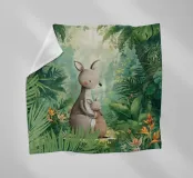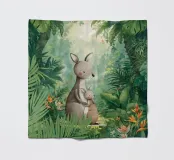 Ein herzerwärmender Aquarelldruck einer Kängurumutter, die ihr Junges in einem üppigen tropischen Dschungel kuschelt. Perfekt für Kinderzimmer oder jeden, der sanfte Tiere und gemütliche Waldatmosphäre liebt.
