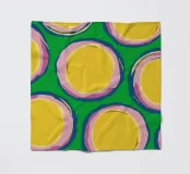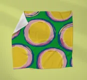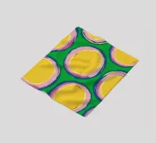 Ein lebhaftes und grafisches Muster aus leuchtend gelben Zitronenscheiben ist auf einem kontrastierenden lindgrünen Hintergrund angeordnet, wodurch ein frisches, spritziges und sommerliches Pop-Art-Design entsteht.
