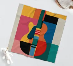 A modern abstract painting featuring geometric shapes forming guitars, violins, and musical notes in a bold, colorful composition. The textured background and dynamic arrangement evoke a sense of rhythm and artistic expression.