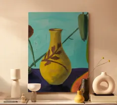 A vibrant still life displays a collection of colorful vases (purple, blue, striped), bowls, and decorative objects artfully arranged on a bright yellow tabletop against a pink and green segmented wall.