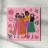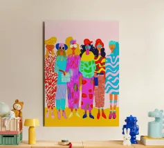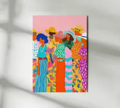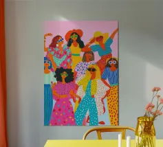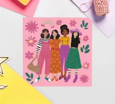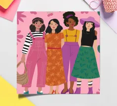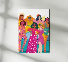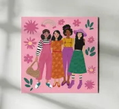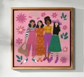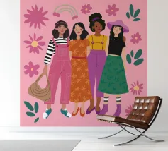 Eine herzerwärmende Illustration von drei verschiedenen Freundinnen, die zusammen stehen, lächeln und sich umarmen. Sie sind in farbenfrohen, stilvollen Outfits vor einem rosa Hintergrund mit floralen Elementen gekleidet und feiern Freundschaft und Schwesternschaft.