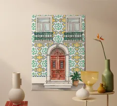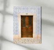 Eine bezaubernde Holztür vor dem Hintergrund traditioneller portugiesischer blauer und weißer Azulejo-Fliesen in der Küstenstadt Ericeira. Die komplizierten Muster der Kacheln bilden einen schönen Kontrast zu der reichen Textur des Holzes und dem Kopfsteinpflaster darunter. Ein typisches Beispiel für das architektonische Erbe Portugals und den Charme der Küstenstadt.