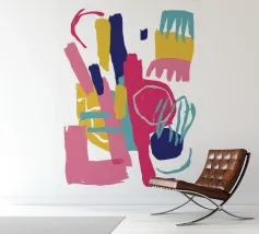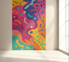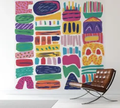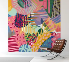 Eine dynamische und chaotische abstrakte Komposition mit einem Patchwork aus leuchtenden Farben, energischen Kritzeleien und kühnen, modernen Mustern. Das Werk ist eine fröhliche, ausdrucksstarke und kraftvolle Feier der kreativen Energie.