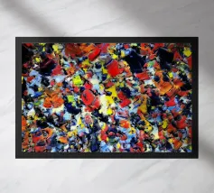 Kräftige blaue und grüne Strudel verflechten sich mit leuchtendem Rot und Orange zu einer dynamischen und energiegeladenen Komposition. Abstrakte Formen und breite Pinselstriche erwecken ein Gefühl von Bewegung und Fluidität