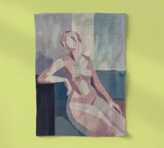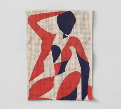 Eine abstrakte, minimalistische Darstellung einer liegenden menschlichen Figur, die mit kräftigen Farbblöcken - Rot, Weiß und Erdtönen - die Schönheit der menschlichen Form durch Form und Haltung erkundet.