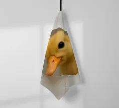 Ein niedliches Entenküken lugt unter einem weichen weißen Handtuch hervor. Seine flauschigen gelben Federn und seine neugierigen Augen schaffen eine bezaubernde und charmante Szene.