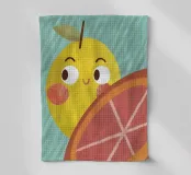 Die fröhliche Illustration zeigt eine lächelnde gelbe Zitronenfigur neben einer Orangenscheibe.