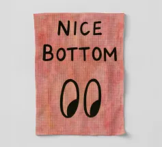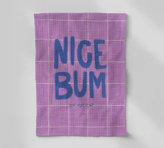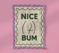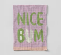 Die bunte Illustration Malerei mit minimalistischer Typografie präsentiert den humorvollen Spruch "Nice Bum" in fetten Buchstaben. In Pastel Farben von Rosa, Violett, Orange und Hellblau wird das Gesäß kreativ inszeniert. Diese verspielte Darstellung feiert Körperlichkeit und Erotik auf abstrakte Weise.