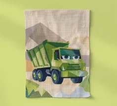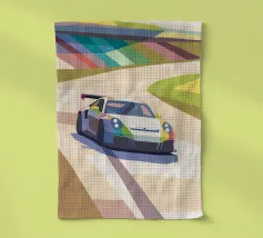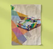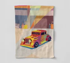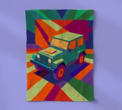 Holen Sie sich eine Illustration von einem bunten Oldtimer in der Wüste mit einem modernen geometrischen Stil.