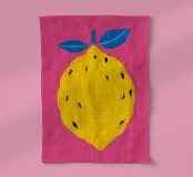 Eine große, einzelne gelbe Zitrone, illustriert mit einem strukturierten, düsteren Stil vor einem leuchtend rosa Hintergrund. Das Werk ist eine kühne, moderne und grafische Pop-Art-Interpretation einer klassischen Frucht.