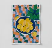 Eine saubere, grafische Illustration einer blauen Schale, gefüllt mit leuchtend gelben Zitronen, auf einer blau-weiß karierten Tischdecke, die eine frische und fröhliche Szene schafft.