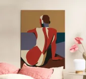 Eine abstrakte, minimalistische Darstellung einer liegenden menschlichen Figur, die mit kräftigen Farbblöcken - Rot, Weiß und Erdtönen - die Schönheit der menschlichen Form durch Form und Haltung erkundet.