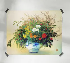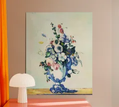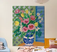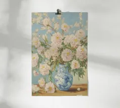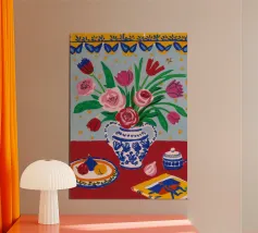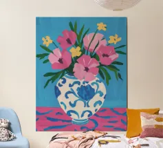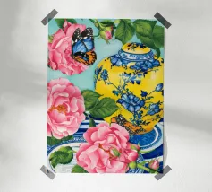 Ein lebhaftes Stillleben mit einer blau-weiß gemusterten Vase, die mit blauen Hortensien und anderen Blumen überquillt, mit Schmetterlingen vor einem hellen türkisfarbenen Hintergrund.