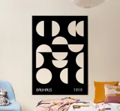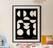 Ein meisterhaftes, vom Bauhaus inspiriertes Plakat zum Gedenken an 1919 mit einem stark geometrischen Muster aus Halbkreisen und Viertelkreisen. Die monochromatische Palette ist kontrastreich, mit cremefarbenen Formen, die dynamisch vor einem tiefschwarzen Hintergrund angeordnet sind. Durch die rhythmische Anordnung dieser einfachen Formen entsteht ein abstraktes, ineinandergreifendes Muster, das die Ästhetik der Minimalistischen Moderne perfekt verkörpert. Dieser hochwertige digitale Download bietet 7000x5000 Pixel bei 300 dpi, was eine außergewöhnliche Klarheit und hervorragende Druckqualität für einen anspruchsvollen Großformatdruck gewährleistet.